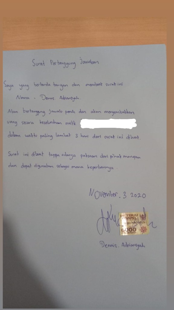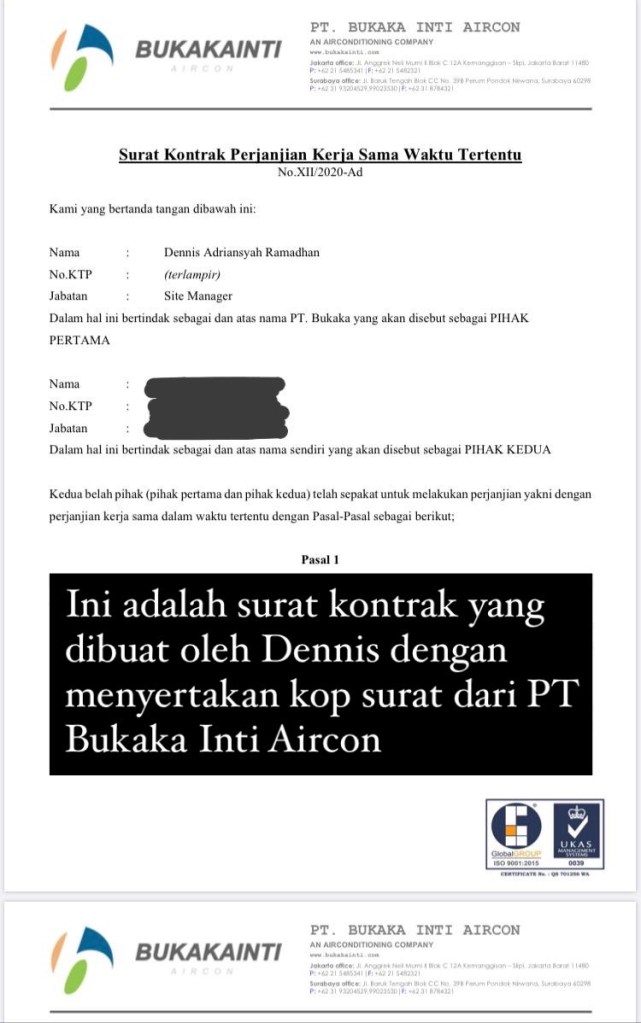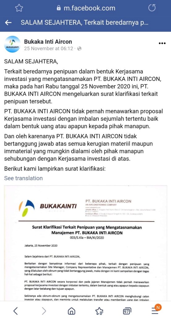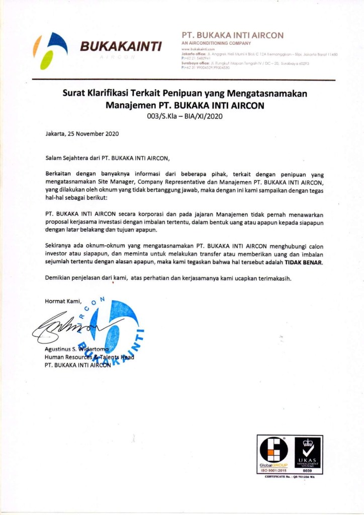 Sementara, saat Dennis menghilang selama kurang lebih satu minggu setelah dikonfrontasi mengenai penipuan ini, saya mencoba menghubungi PT. Bukaka Inti Aircon. Informasi yang saya dapatkan dari perusahaan tersebut adalah Dennis sudah tidak lagi bekerja disana, terhitung Agustus 2020. Dan ternyata, PT Bukaka juga menerima laporan serupa dari korban lainnya. Sebagai tindak lanjut dari laporan tersebut, mereka pun mengeluarkan surat terbuka sebagai klarifikasi bahwa PT Bukaka Inti Aircon tidak pernah menawarkan investasi pengadaan barang ataupun investasi kepada publik. Jelas bahwa apa yang dilakukan Dennis adalah penipuan.