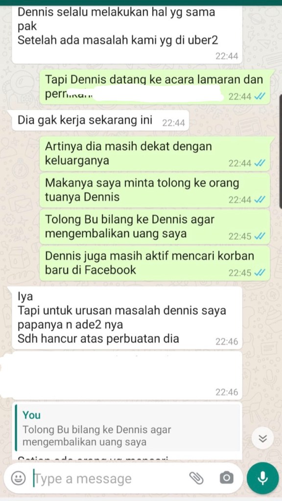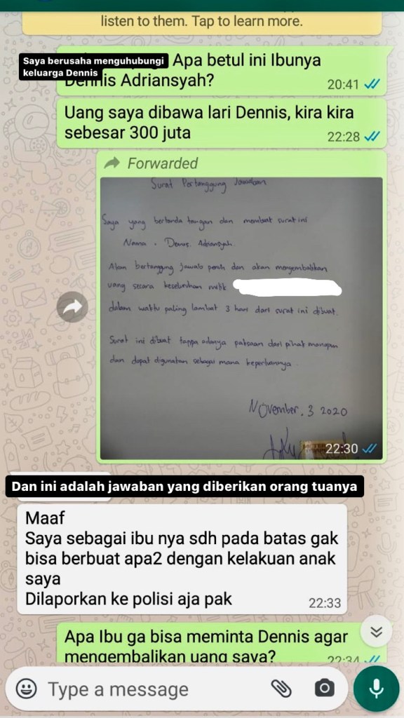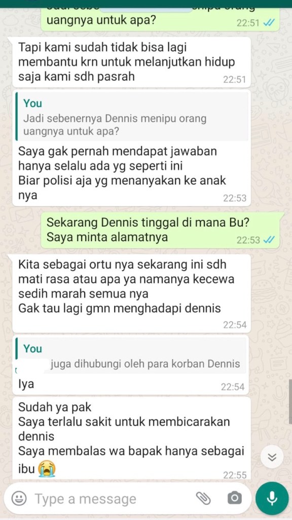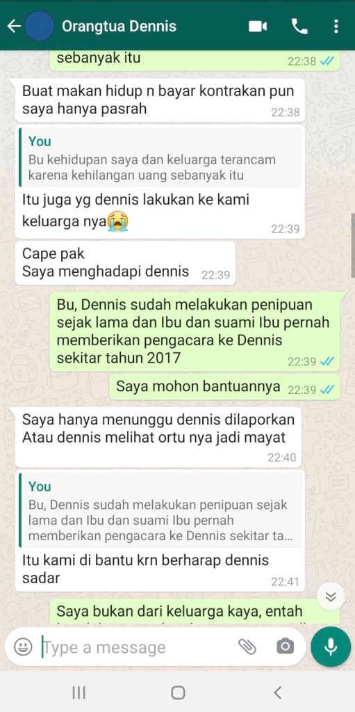 Kami, para korban masih mengharapkan itikad baik dari Dennis untuk menyelesaikan masalah ini, tapi di luar itu, jujur kami muak dan resah karena tahu sampai saat ini Dennis masih terus menipu. Terkait dengan Dennis yang menghilang dan tidak ada itikad untuk menyelesaikan masalah, kami pun mencoba untuk menghubungi pihak keluarga. Beberapa korban lain pernah bertemu langsung dengan orang tua Dennis. Sementara, saya pribadi mencoba menghubungi orang tua Dennis melalui whatsapp.