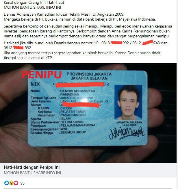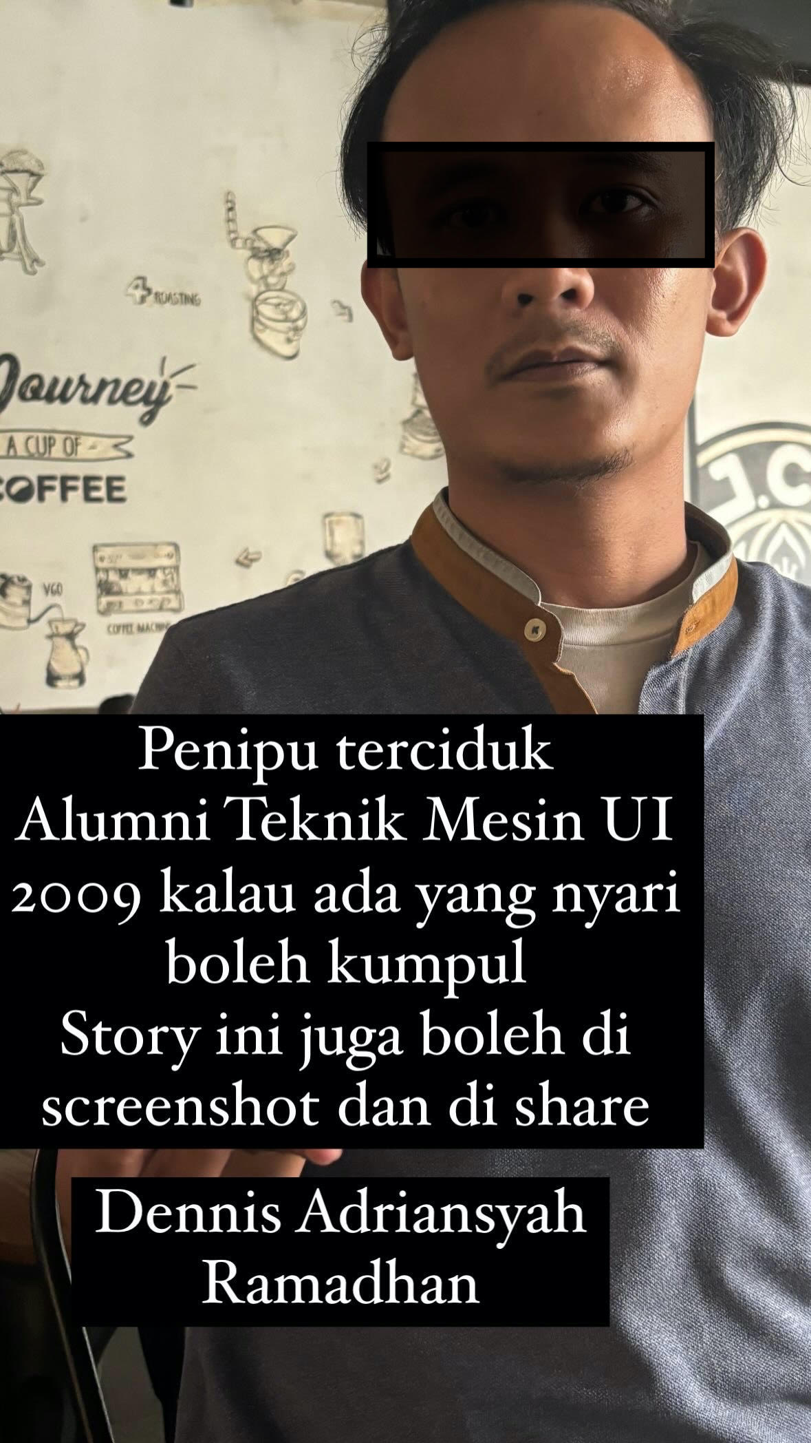 Saya ingin sedikit cerita mengenai penipuan yang belakangan saya alami. Penipuan ini dilakukan oleh teman lama saya (Dennis Adriansyah Ramadhan, 28 Tahun) dengan modus investasi atas nama suatu perusahaan. Dennis adalah alumni dari SMAN 28 Jakarta dan Teknik Mesin 2009. Siapa yang sangka, teman lama yang merupakan alumni dari sekolah juga perguruan tinggi ternama bisa melakukan penipuan? Tapi itulah yang telah dilakukan Dennis. Dennis melakukan penipuan kepada sejumlah teman lamanya dengan menawarkan investasi atas nama perusahaan tertentu. Kerugian yang dialami korban-korbannya mencapai ratusan juta rupiah.