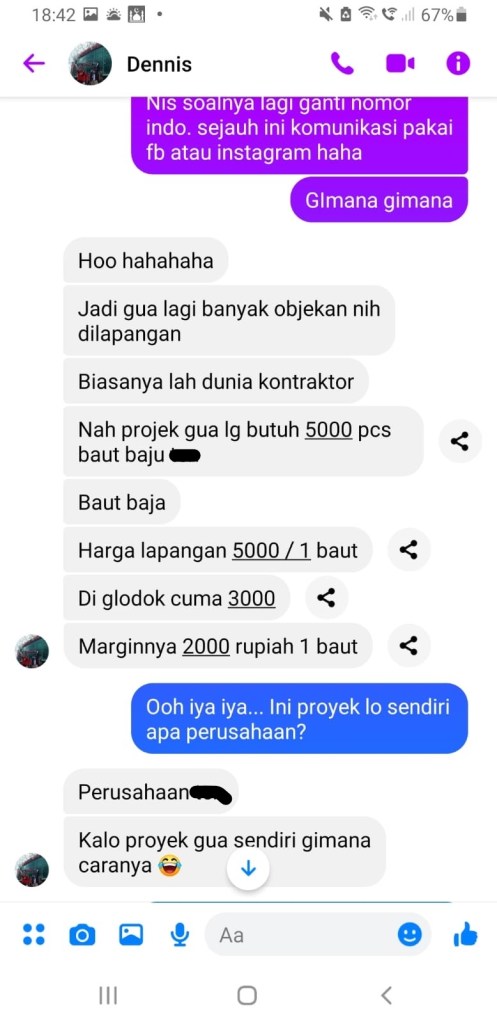 Kejadian ini saya alami sekitar bulan September – Oktober 2020. Dennis menawarkan investasi pengadaan barang atas nama PT. Bukaka Inti Aircon. Ia mengaku sebagai project manager di PT Bukaka Inti Aircon dan mengajak saya untuk berinvestasi di perusahaannya. Untuk meyakinkan saya, Dennis sengaja mengajak bertemu langsung untuk menjelaskan investasi yang dimaksud (berupa pengadaan barang). Dennis menunjukkan KTP, SIM, dan kartu nama atas perusahaan yang dimaksud. Dennis juga mempersilahkan saya untuk mem-foto semua identitasnya, bahkan mengajak untuk berfoto bersama dengan kartu namanya.